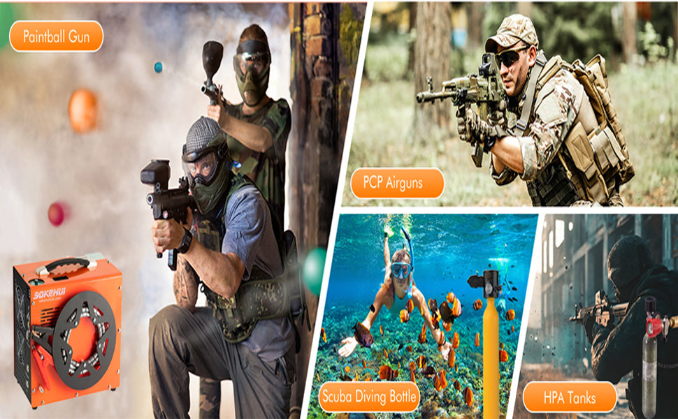 The SDKEHUI paintball tank compressor is versatile. It comes with a 500W built-in power converter. This allows it to run on both AC 110V and 12V car batteries. So, it’s suitable for both indoor and outdoor use. No matter if you're at home or on the go, power is always available. The flexibility in power options is perfect for different environments. Paintball guns, PCP air guns, and scuba diving bottles are just a few examples. You can easily apply this compressor to various applications. It is ideal for paintball. We have designed our PCP air guns using high-quality materials. We have made them easy to carry around as well. That said, we make it an excellent tool for many applications too. Our compact design makes it easy to carry and use in various settings due to its portable features.