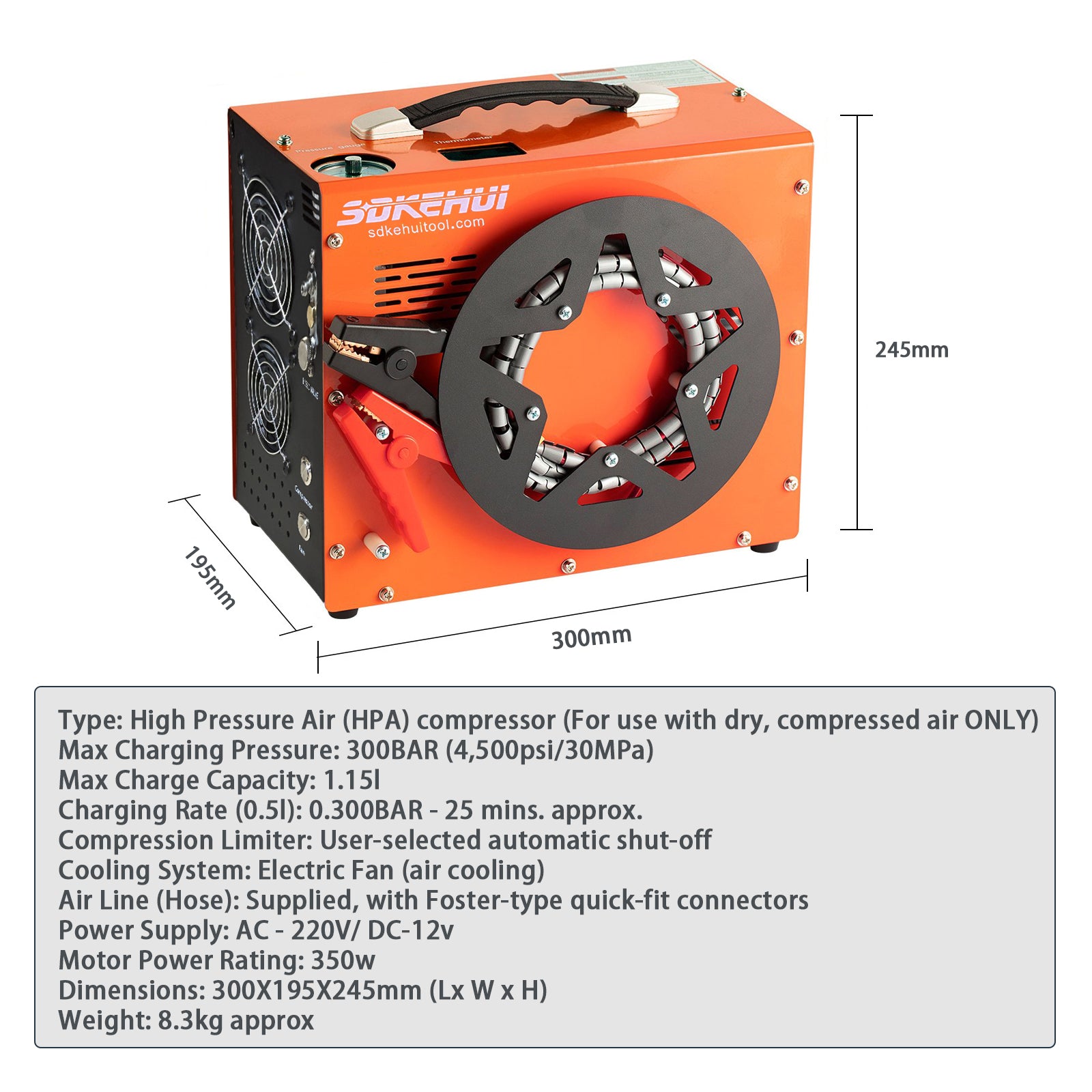 SDKEHUI PCP Air Compressor: Unlimited air supply, anytime, anywhere! It provides DC12V and AC110V dual charging options. Enjoy hassle-free and rapid inflation with SDKEHUI: 4500PSI maximum pressure, real-time temperature and pressure display, and auto stop.