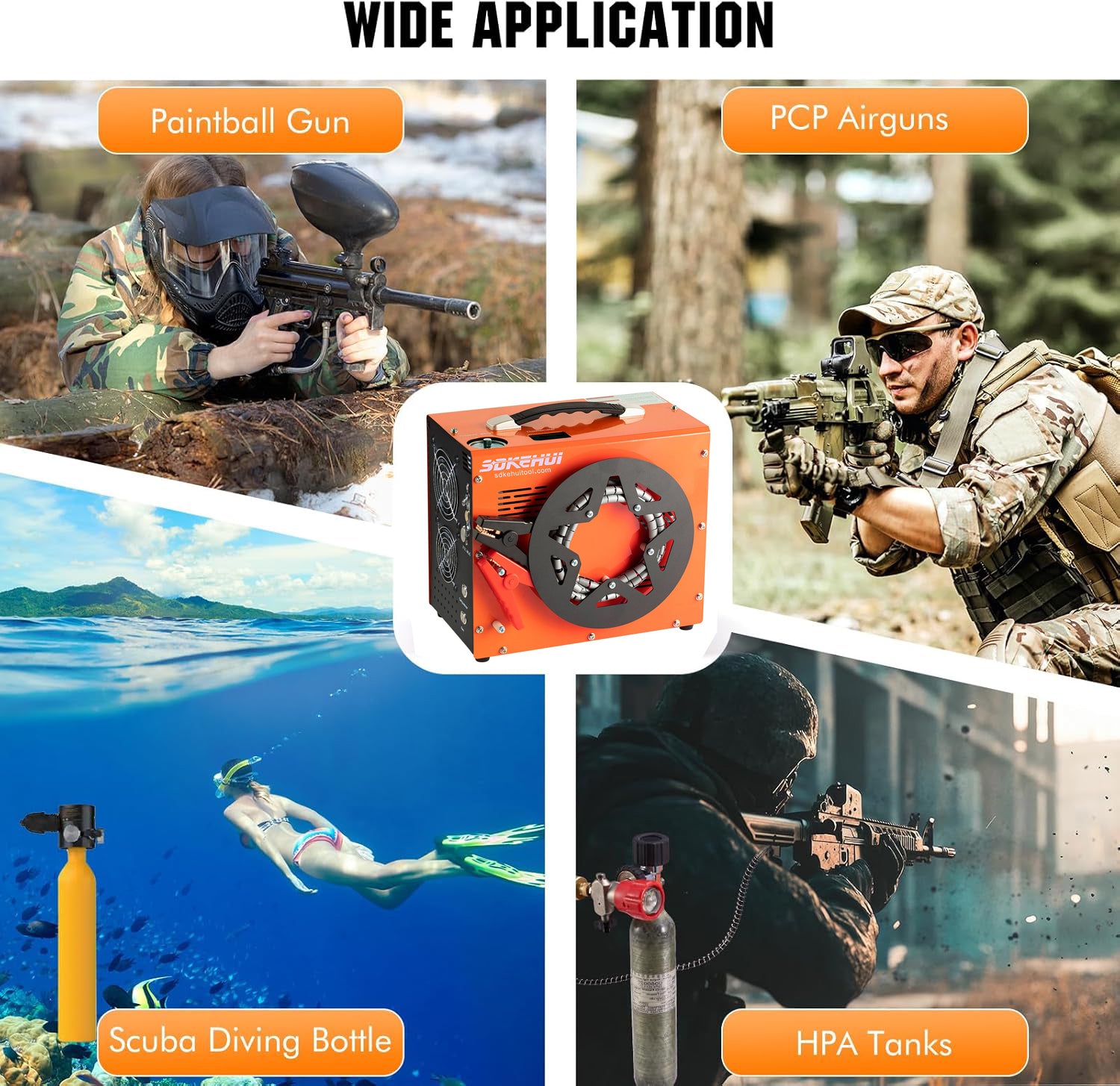 The SDKEHUI paintball tank compressor is versatile. It comes with a 500W built-in power converter. This allows it to run on both AC 110V and 12V car batteries. So, it’s suitable for both indoor and outdoor use. No matter if you're at home or on the go, power is always available. The flexibility in power options is perfect for different environments. Paintball guns, PCP air guns, and scuba diving bottles are just a few examples. You can easily apply this compressor to various applications. It is ideal for paintball. We have designed our PCP air guns using high-quality materials. We have made them easy to carry around as well. That said, we make it an excellent tool for many applications too. Our compact design makes it easy to carry and use in various settings due to its portable features.